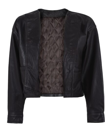 Women’s Black Cropped Leather Jacket with Button Closure – Minimalist Modern Style