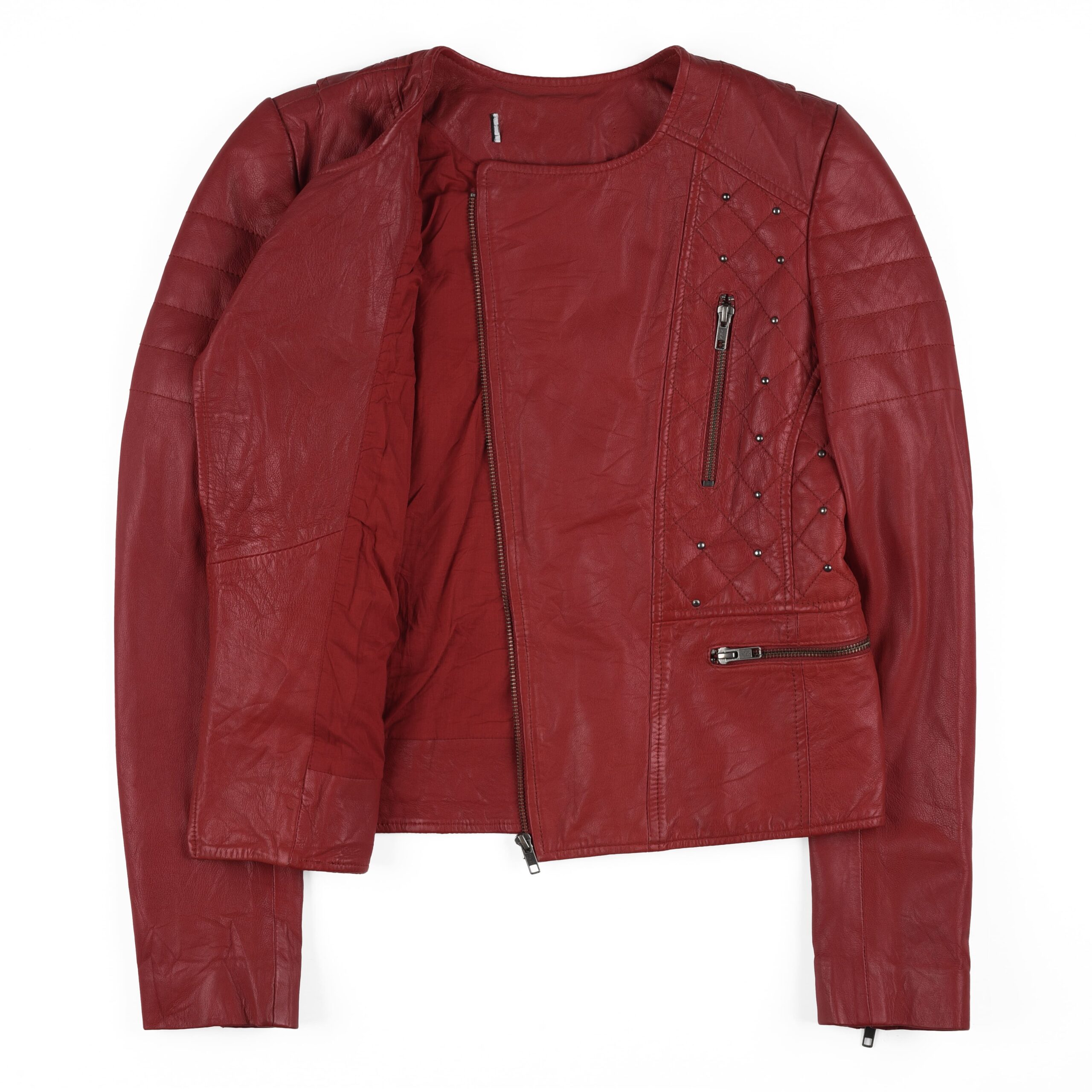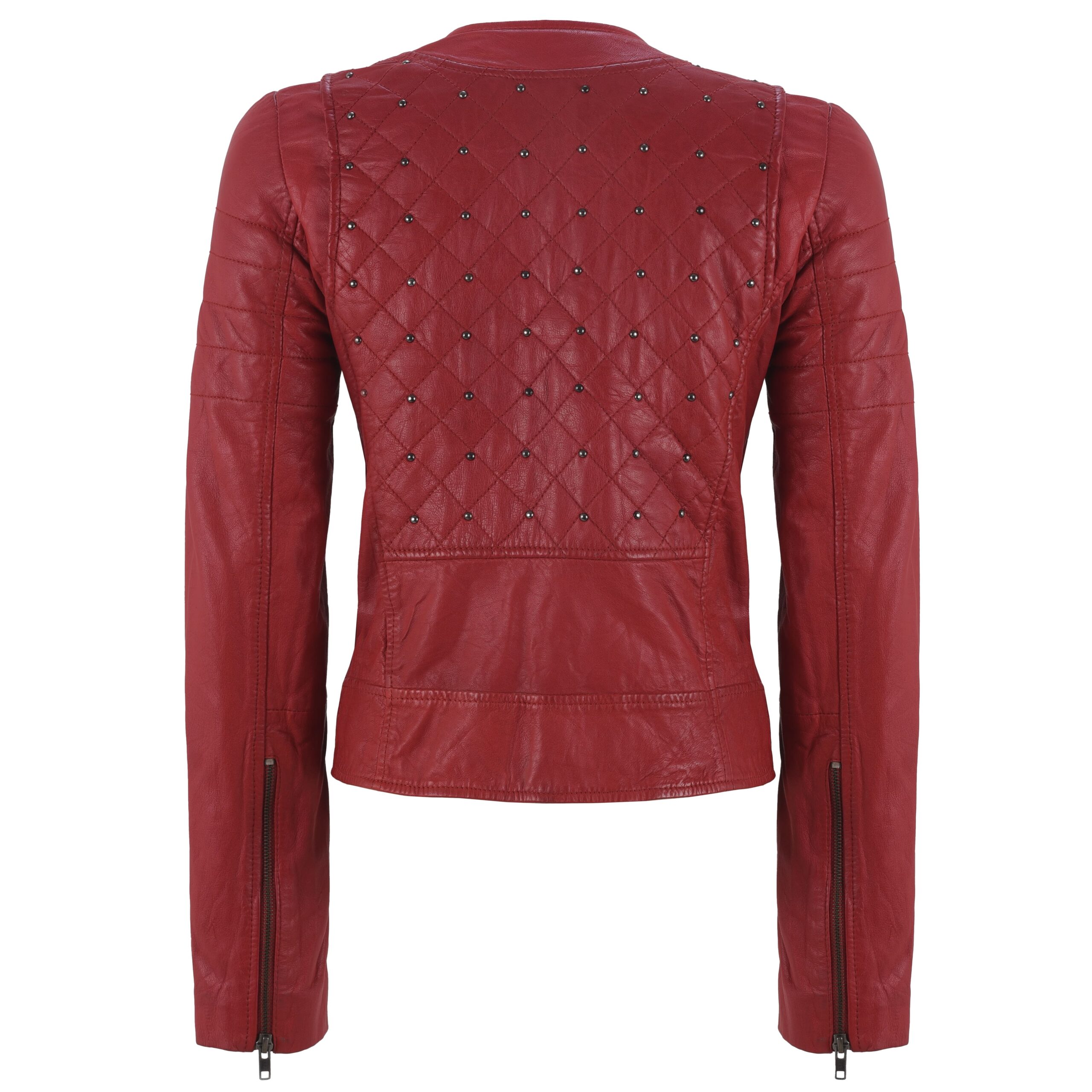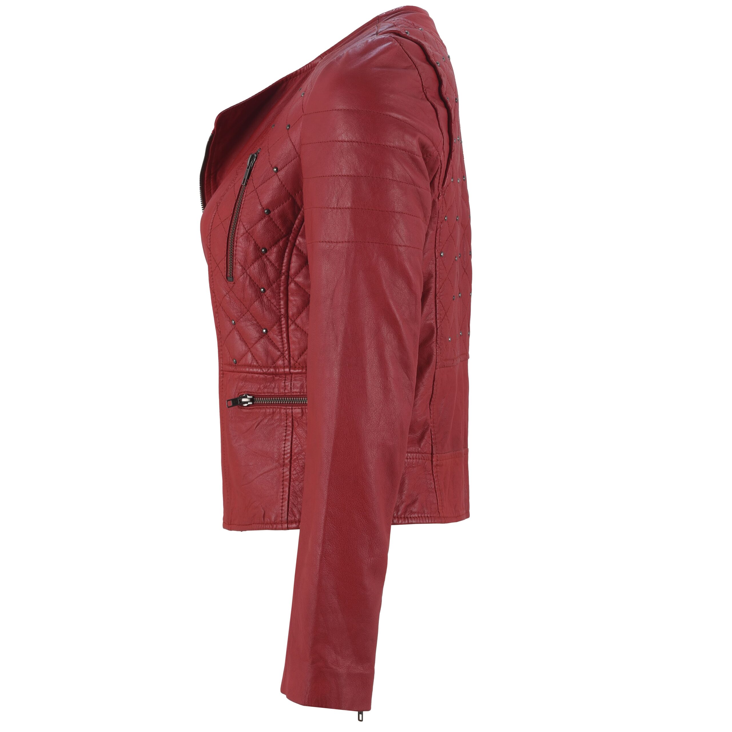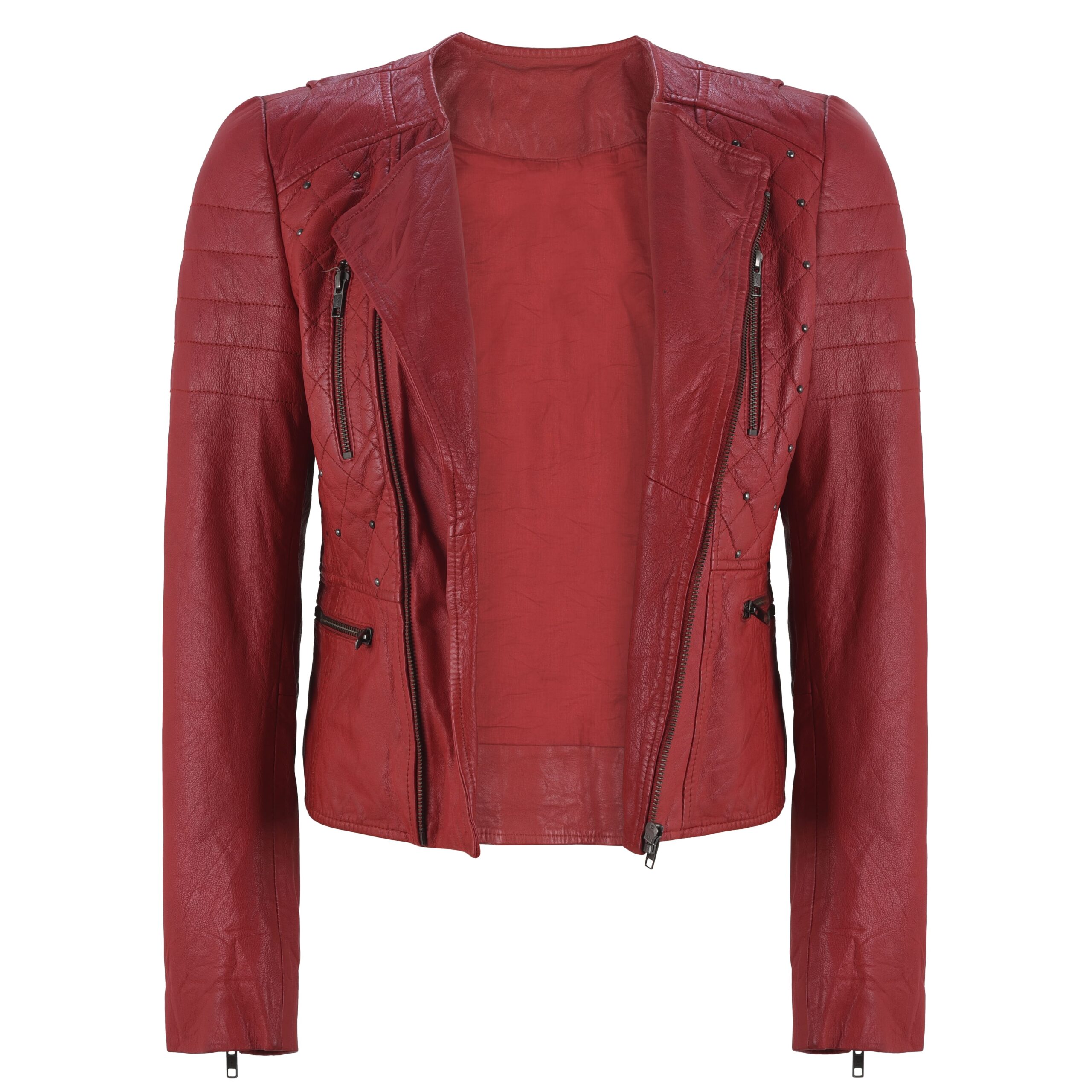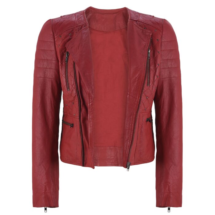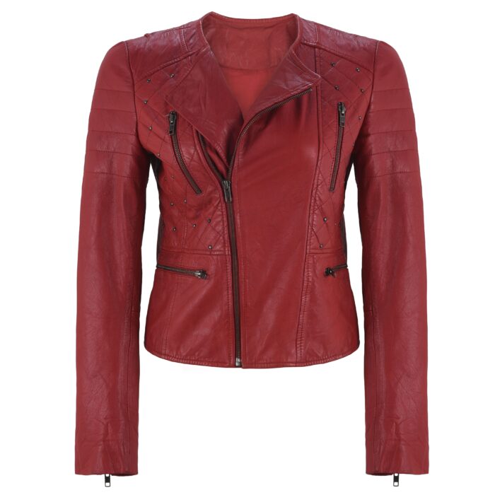 Women’s Red Studded Leather Biker Jacket – Quilted Slim Fit Moto Style
